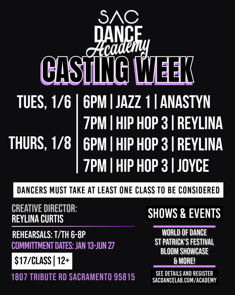 Sac Dance Academy is our pre-professional teen dance company! In addition to performing in our seasonal showcases, the Academy performs at outdoor events, films concept videos and aims to represents the young commercial dance talent in our city. We work with serious young dancers eager to train and grow in a positive, structured environment!