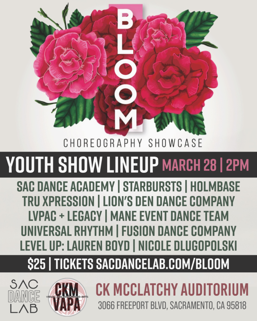 Thanks for your interest in performing at Sac Dance Lab’s 5th Annual BLOOM Choreography Showcase on Saturday, March 28, 2026.