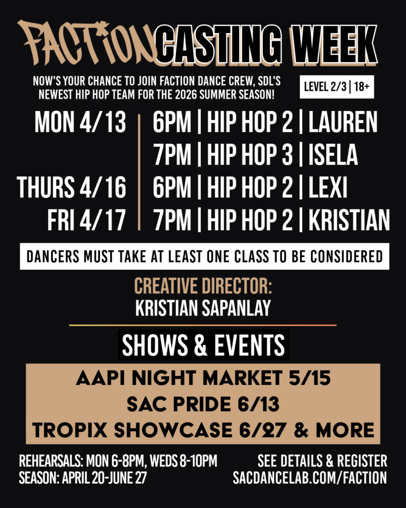 Faction is Sac Dance Lab’s brand new crew: a seasonal hip hop performance team delivering sharp choreography and high-impact stage presence led by Kristian Sapanlay.