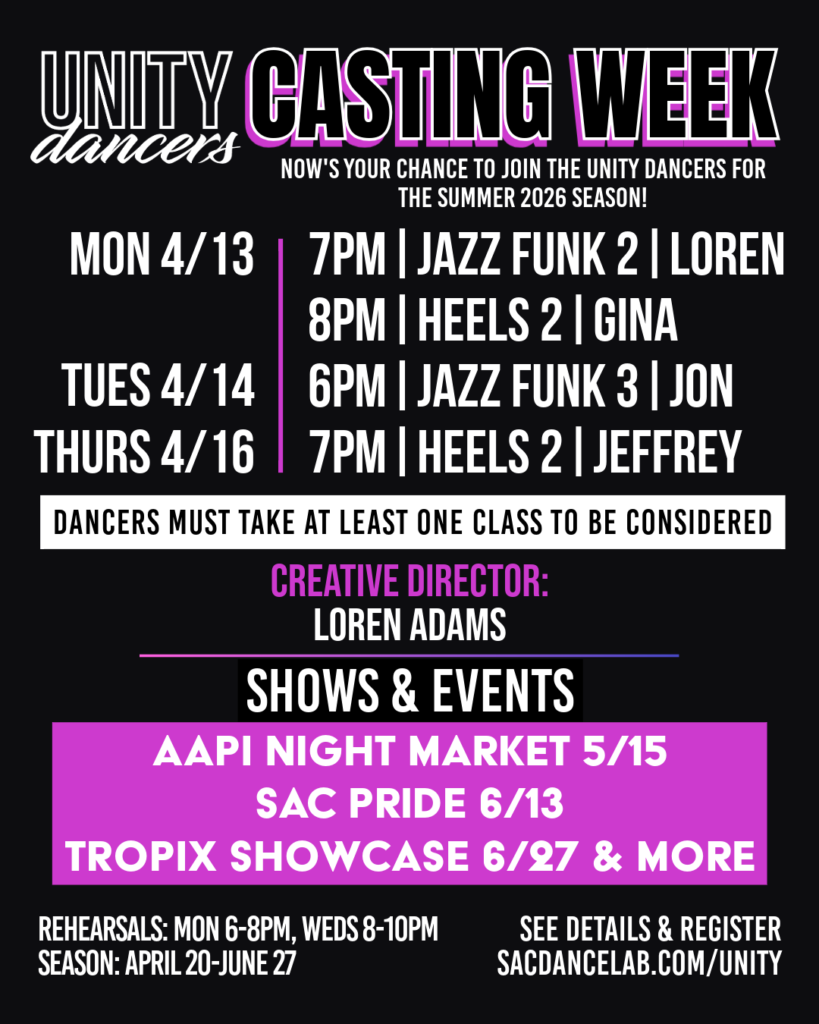 UNITY is a seasonal performance team that brings high-energy femme choreography to the Sacramento dance scene. From sharp lines to full-out performance moments, this team shows up ready to entertain! Each season, UNITY takes the stage at community events around the region and at various Sac Dance Lab productions, representing the local dance community with style and spirit.